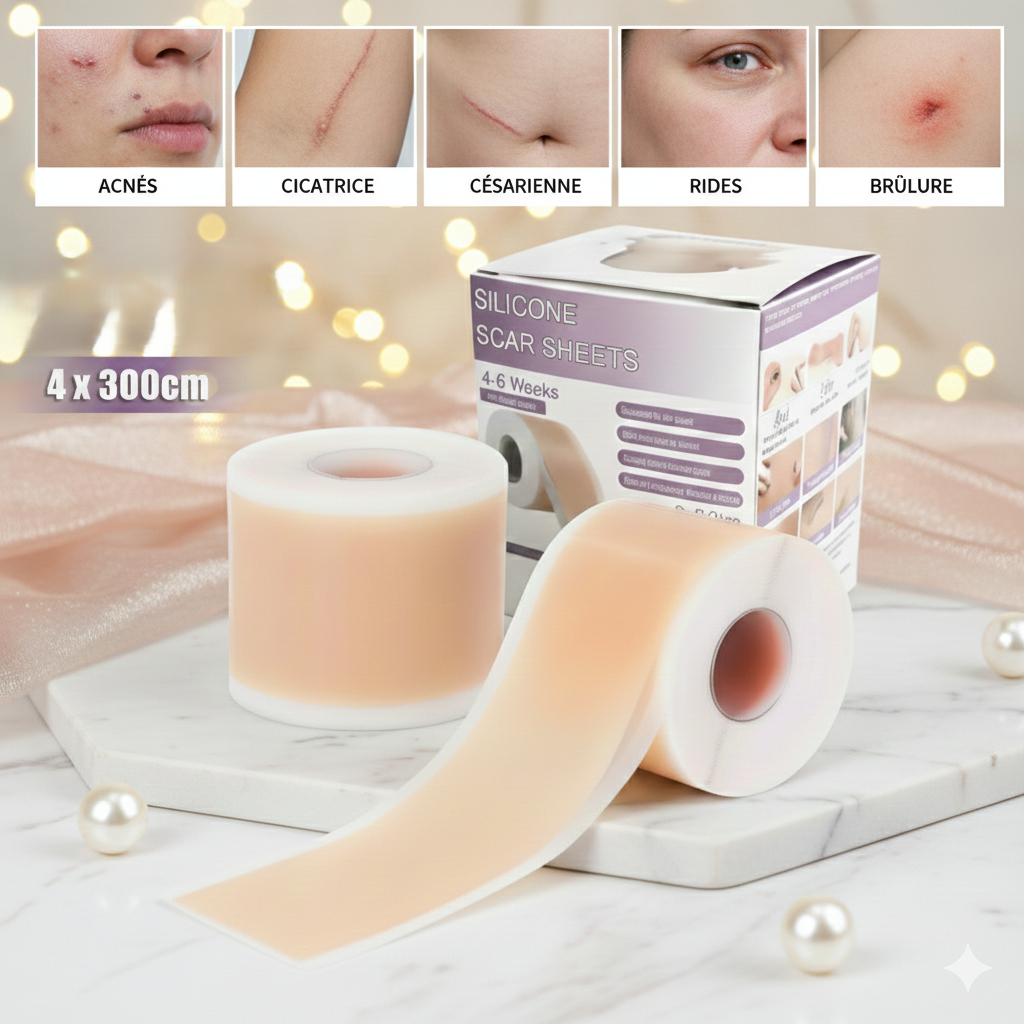 Cicatrices d’acné, traces, marques cutanées… le ruban en silicone permet une régénération en profondeur.
